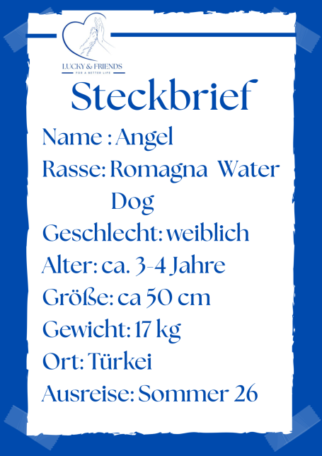 Angel. Ein Name der viel verspricht. Unsere Angel ist ein Romagna Water Dog und wurde aus einer Vermehrerstation gerettet. Angel wird auf ca. 3-4 Jahre geschätzt. Obwohl sie in dieser Zeit ein tristes Leben führte, hat sie Lebensfreude nicht verloren. Ob Mensch oder Tier, jeder wird freundlich begrüßt und als Freund gesehen. Katzen sind für sie auch kein Problem. Auf Grund ihres Charakters ist sie ein idealer Hund für Anfänger, der bereit ist mit ihr in ein neues Leben zu starten. Angel befindet sich zur Zeit noch auf unserem Hof in der Türkei und kann auf Grund der Quarantanebestimmungen im Sommer ausreisen. Sie ist gechipt, vollständig geimpft, sterilisiert und negativ auf Mittelmeererkrankungen getestet.