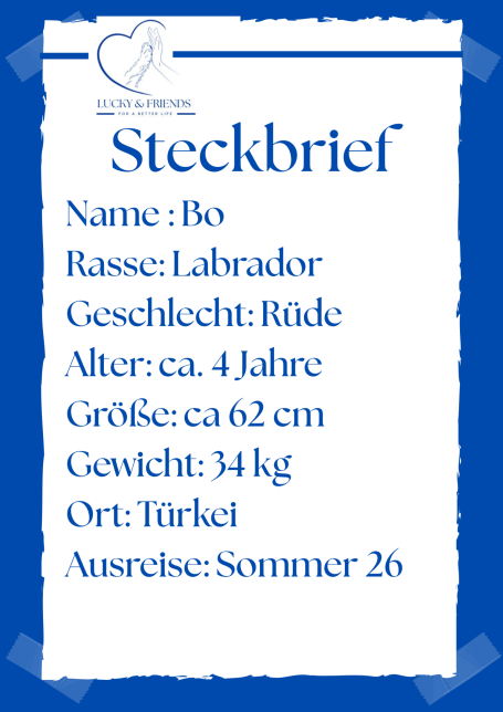 Bo wurde leider bei der Erstuntersuchung positiv auf Ehrlichiose getestet und direkt erfolgreich behandelt. Er ist gechipt, vollständig geimpft und befindet sich zurzeit noch auf unserem Schutzhof in der Türkei. Ausreise ab Sommer 2026 möglich.